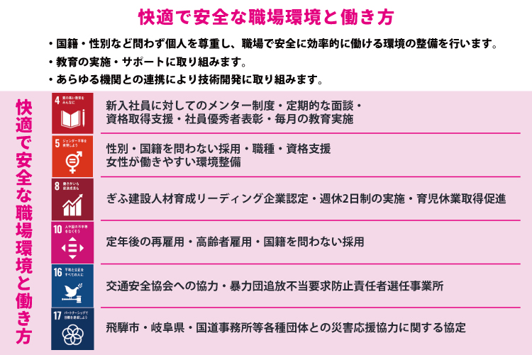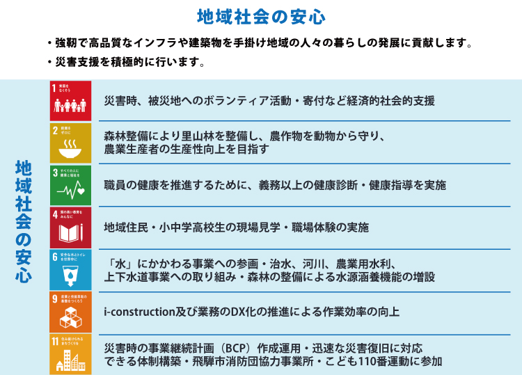 地域に密着した建設事業者として建物や社会資本の整備・維持管理に携わり、「安全安心な社会」「持続可能な社会」「誰一人取り残さない社会」の実現をめざします。